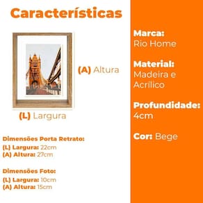 Ideal para fotos 10x15cm, 13x18cm e 15x20cm, a moldura possui design minimalista e medidas de 22cm de largura, 27cm de altura e 4cm de profundidade, garantindo estabilidade para apoio em bancadas, racks e mesas.