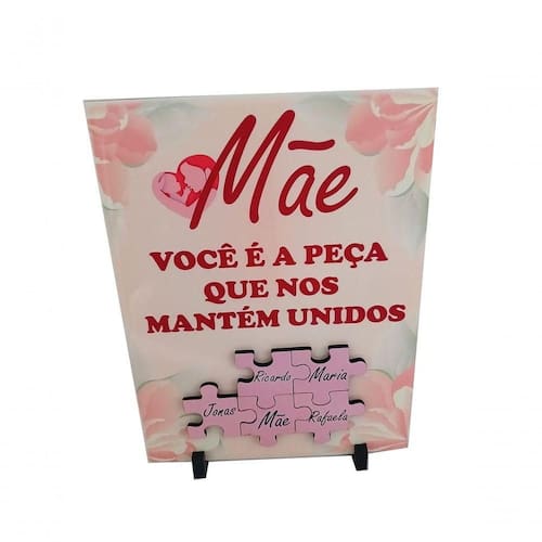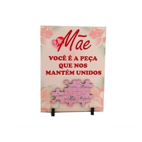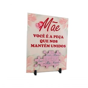 Imagine a emoção dela ao receber um azulejo adornado com peças de quebra-cabeça para combinar, onde cada peça está escrito o nome dos filhos, filhas, de membros da familia E no centro a palavra que une tudo isso MÃE, e a mensagem comovente: Mãe, você é a peça que mantém todos unidos.