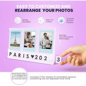 - Insira mensagens amorosas: aprimore sua exibição de fotos com nossa carta de desktop Instax, com folhas de PVC com o alfabeto completo e muito mais. Personalize cada quadro com rótulos e mensagens curtas, adicionando um toque único e sincero às suas memórias mais queridas.