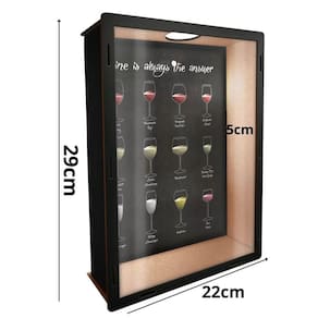 Dimensões: Comprimento: 28 cm; Largura: 21 cm; Profundidade:5 cm; Texto ao fundo: Wine is always the answer Vinho é sempre a resposta ; Imagem: Tipos de Vinhos; Película transparente em PET, não trinca ou amarela como o acrílico; Produto entregue já montado; Corte à Laser - Extrema Qualidade e Acabamento; Fabricado com 100% madeira de reflorestamento; Fixação por parafuso ou fita dupla face Estes itens não acompanham o produto ; Estampa impressa em Adesivo de Alta Resistência;