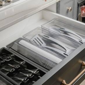 O organizador e cortador de rolos é a solução para manter a cozinha organizada. Pensado para rolos de plástico filme, papel alumínio e papel manteiga. O cortador acomoda dois rolos de 15 a 30 metros e até 30 cm de comprimento, garantindo que tudo fique no lugar. Proporciona mais praticidade para a rotina na cozinha, pois mantêm os rolos sempre prontos para uso, com um corte perfeito a cada utilização. As ventosas na base estabilizam o organizador, seja dentro da gaveta ou sobre a bancada. Para trocar os rolos basta abrir a tampa com os botões laterais, inserir os rolos e fechar.