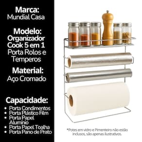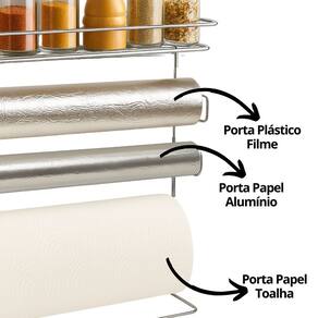 5 funções em 1 só suporte: Porta papel toalha, papel alumínio, plástico filme, condimentos/temperos e pano de prato.