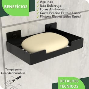 Com um design minimalista, o preferido pelos arquitetos nos últimos tempos, o Porta Sabonete é fabricado utilizando aço inox com acabamento em Pintura Eletrostática Epóxi Fosca proporcionando maior durabilidade, resistência e garantindo que não ocorrerá oxidação nem ferrugem.