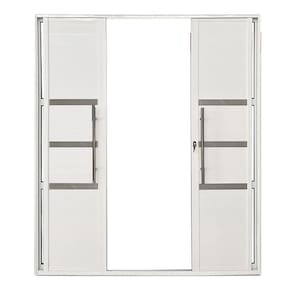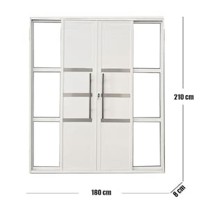 Esse produto fabricado em alumínio 3x mais pesado que o convencional, Linha Veneza, na cor branca, possui quatro folhas, sendo duas fixas de vidro e duas móveis em lambril com friso e pintura eletrostática branca. No tamanho 210cm de altura por 150cm de largura, com uma espessura de 8cm e um vão de 68cm, pesando cerca de 49kg.