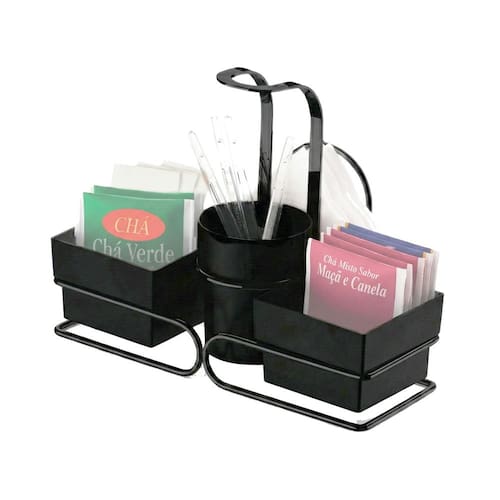 Com alça para facilitar o transporte até a mesa, o Conjunto para Chá/Café comporta: saquinhos de chá, sachês de açúcar e adoçante, mexedores e guardanapos de tamanho pequeno.