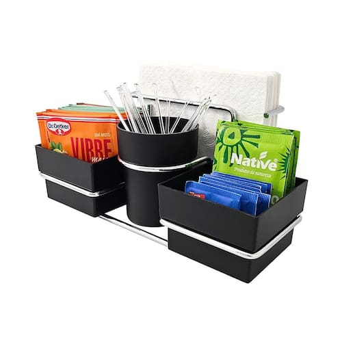 O conjunto para chá e café é prático e funcional, ideal para levar a mesa ou deixar na bancada do café. Os recipientes plásticos são ideais para armazenar saquinhos de chá, sachês de açúcar e adoçante e os mexedores.
