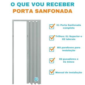 É fornecida com trilhos (Laterais e Superior), puxadores, buchas, parafusos, trinco e manual de instruções na embalagem do produto.