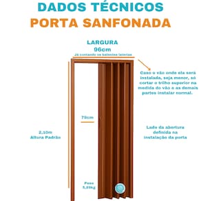 Especificações: É fornecida com trilhos (Laterais e Superior), puxadores, buchas, parafusos, trinco e manual de instruções na embalagem do produto. Altura padrão: 2,10m Largura já com os batentes: 96cm Acompanha Manual de Instalação: Sim Acompanha Puxador: 02 Acompanha Trinco: Sim Ambiente: Interno Composição: PVC Itens Inclusos: 1 Porta, 1 Kit de Instalação e 1 Manual de Instalação. Lado de abertura: Definido na instalação Necessita Montagem: Sim Possui Grade: Não Quantidade de peças por embalagem: 1 Textura da Porta: Lisa Tipo de Parede que pode ser aplicada: Alvenaria, Drywall e Madeira Tipo de Porta: Sanfonada *Não acompanha acabamento/vista/caixilho*