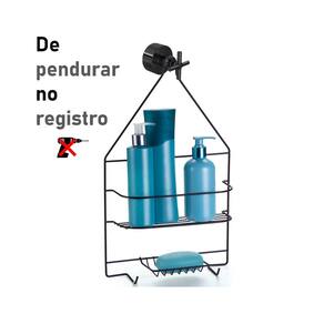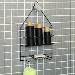 Espaço para shampo, condicionador, cremes, saboneteira incluída e 2 ganchos adicionais para buchas e acessórios de banho