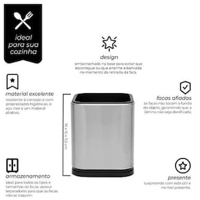 A sua resistência à corrosão e propriedades higiênicas e estéticas fazem do aço inox um material muito atrativo, além de manter suas propriedades mesmo quando submetida a elevadas ou baixas temperaturas. Reciclável e de grau alimentício. Nosso porta facas foi projetado para armazenar facas de todos os tamanhos. Possui um detalhe emborrachado na base para evitar que escorregue ou que arranhe a bancada no momento da retirada da faca. Tem a cor prata, escovada. Medidas: C- 10cm L- 10cm A- 11,5cm e pesa 225 gramas. Surpreenda com este útil e incrível presente. Presente perfeito para dia das mães, aniversários, natal, casamentos ou inauguração de casas de amigos ou familiares.