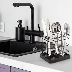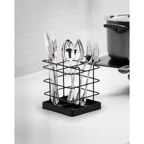 Porta-Talheres Arthi Black (2363) - Divisórias e Base Plástica O Porta-Talheres Quadrado da Arthi é o acessório ideal para organizar e secar seus talheres na bancada. Seu design combina a modernidade da cor preta com divisórias internas para separação e uma base plástica, facilitando a drenagem e a limpeza. Características Físicas e Funcionais: Design Moderno: Estrutura externa com acabamento na cor Black (preto) que confere um visual contemporâneo à sua cozinha. Organização Eficiente: Possui divisórias internas que permitem separar talheres por tipo (garfos, colheres), facilitando a organização e a secagem. Base Plástica: A base é removível e fabricada em plástico, o que facilita a drenagem da água e a higienização do escorredor, evitando acúmulo de sujeira. Formato Quadrado: Design compacto, ideal para otimizar o espaço na bancada. Marca: Arthi (Ref. 2363). Especificações Técnicas: Funcionalidade: Escorredor e Organizador de Talheres. Dimensões: Comprimento 14,5 X Largura 12,5 X Altura 14,2 cm Material: Aço/Metal (corpo Black) e Base Plástica.