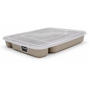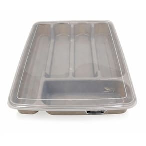 Porta Talheres Com Tampa é uma solução prática para manter seus utensílios em ordem na gaveta da cozinha. Feito de plástico resistente, este organizador possui um design elegante em cinza, adaptando-se perfeitamente às dimensões padrão das gavetas.