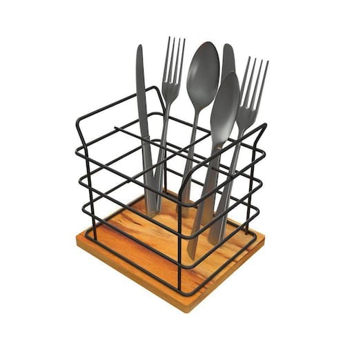 O Porta Talheres Decorativo de Aço e Madeira Teca ;tem o acabamento em epóxi pó, responsável pela coloração preto fosco, ele é uma forma de pintura que envolve toda a superfície do produto, garantindo que o aço fique protegido da água e outros agentes que possam influenciar na vida útil do produto. Esta pintura, além de moderna, é extremamente recomendada para as indústrias, pois a taxa de impactos ao meio ambiente são menores e por não possuir solventes em sua composição.