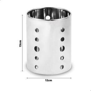 - Material de alta qualidade: Fabricado em aço inoxidável, o porta talheres oferece durabilidade, resistência e uma aparência elegante. - Design compacto e funcional: Com um diâmetro de 12 cm e altura de 15 cm, o porta talheres tem um tamanho ideal para acomodar uma quantidade significativa de talheres e utensílios sem ocupar muito espaço em sua cozinha. - Compartimentos espaçosos: Possui compartimentos amplos e separados para organizar diferentes tipos de talheres, como garfos, facas, colheres e utensílios maiores, proporcionando fácil acesso e evitando bagunça. - Fácil limpeza: O aço inoxidável é resistente a manchas e corrosão, facilitando a limpeza do porta talheres. Basta lavá-lo com água e sabão ou colocá-lo na lava-louças para uma limpeza mais conveniente. - Design elegante: Com um acabamento brilhante e moderno, o porta talheres adiciona um toque de estilo à sua cozinha, complementando qualquer decoração. - Versatilidade: Além de talheres, você também pode utilizar o porta talheres para armazenar outros utensílios de cozinha, como espátulas, pegadores e colheres de servir.