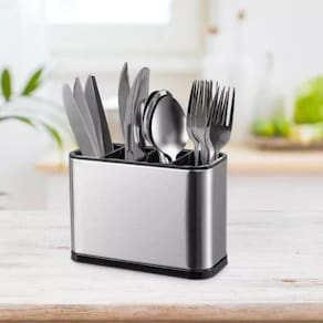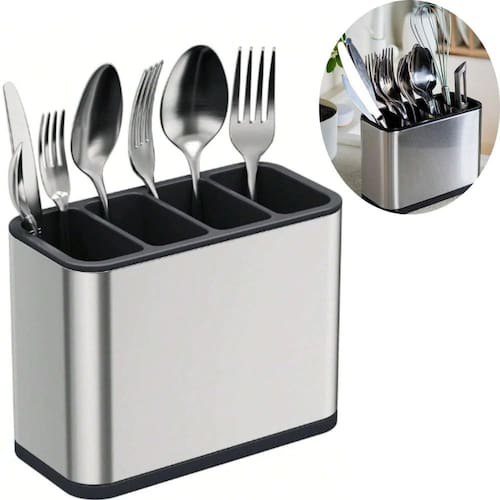 Conteúdo da Embalagem: 1 Porta Talheres Escorredor em Aço Inoxidável com 4 Compartimentos