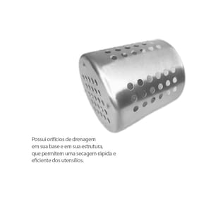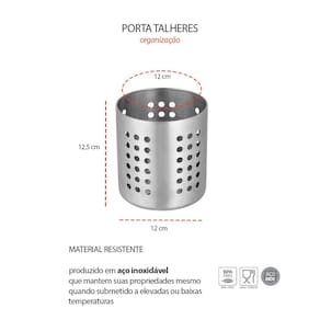 Porta utensilios e talheres produzido em aço inoxidavel. A robustez deste porta utensilios garante a satisfaçao do cliente, mantendo todos utensilios de cozinha em sua bancada, ocupando pouco espaço. Adequado para armazenar, secar e manter seus utensílios organizados. Pode ser utilizado em maquina de lavar louças. Contem: 1 Porta Utensilios Medidas: 12,5 x 12 cm Composiçao: aço inoxidavel