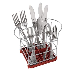 Possui 4 divisões internas para acomodar garfos, facas e colheres de forma organizada. As duas alças laterais facilitam o transporte, enquanto a tela plástica no fundo permite escorrer a água, garantindo higiene e praticidade.