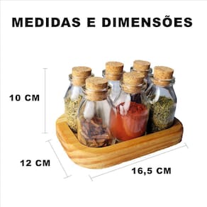 Atenção, por favor, leia a descriçãoO porta temperos ágora é confeccionado em painel de pinus industrial, garantindo acabamento sem igual. Possui 12 cm de largura e 16,5 cm de comprimento. Ele é tratado com óleo mineral usp-70 garantindo material possui toque suave e fácil limpeza.O porta tempero é um item fantástico para organizar temperos e condimentos na bancada, pia, aparador, mesa, entre outros.espessura e cor: disponível com 18 mm de espessura na cor natural, com aplicação de óleo mineral.Ele acompanha 6 potes de vidro reforçado o vidro reforçado 60ml com 8cm de altura e 4cm de largura com rolha portuguesa 100% cortiça natural. Ao contrário de outros materiais a rolha e o vidro não oxidam, não amassam e não criam fungos. Tanto a rolha como o vidro podem ser lavados sem preocupações.Ótima opção para quem deseja decorar o ambiente com muito bom gosto e deixar sua casa ainda mais bonita. Renove seu ambiente e deixe o seu espaço mais acolhedor, moderno e, principalmente, com a sua cara.Características- design único e aconchegante.- ideal para completar a decoração da sua casa.- produzido e tratado com materiais de qualidade.Especificações técnicasMarca: senhora madeiraModelo: ágoraCor: natural - com aplicação de óleo mineral usp 70.Material: painel industrial de madeira, vidro e cortiça natural.Ambientes recomendados: cozinha e áreas recreativas.Informações adicionaistamanho da peça completa: 16,5cm de comprimento x 12,5cm de largura x 10cm de largura.Limpeza do produtoHigienização convencional, recomenda-se não deixar em contato com água por longos períodos.Peso500gDúvidas Marca: Senhora Madeira