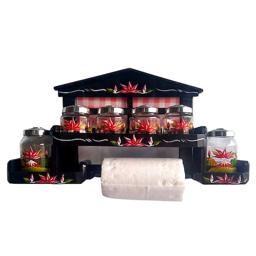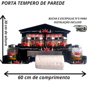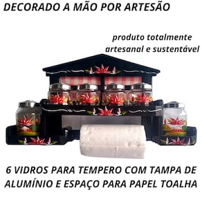 Suporte Para Papel Toalha E Condimentos Com 6 Vidros Lindos porta tempero artesanal com 06 vidros para tempero e espaço para papel toalha Produzido de modo totalmente artesanal decorado a mão Produzido em madeira maciça ( DE LEI ) ecologicamente correta com pintura esmaltada para proporcionar fácil limpeza, os potes para tempero são de vidro, tampa de alumínio com trava. Cabe 1 papel toalha São 4 potes com a capacidade de 220 ml e 2 vidros com a capacidade de 500 ml de capacidade Medidas do suporte: 10 cm de largura 60 cm de comprimento 30 cm de altura