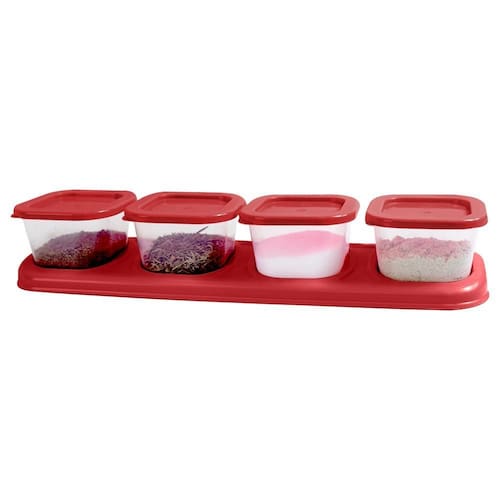 Medidas aprox. Do kit 33x6x8 Cm De cada pote: 6 x 8 cm alt x larg Composição: Plástico Vermelho Ref. Temp4 Keita Marca: Não Informado