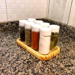 espessura e cor: disponível com 18 mm de espessura na cor natural, com aplicação de óleo mineral. Ele acompanha 6 potes de vidro reforçado o vidro reforçado. O pote de vidro reforçado tem 60ml com 8cm de altura e 4cm de largura com rolha portuguesa 100% cortiça natural. Ao contrário de outros materiais, a rolha e o vidro não oxidam, não amassam e não criam fungos.