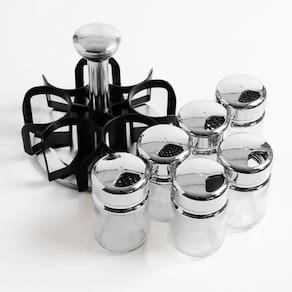 Porta Condimentos com 6 recipientes em vidro. Temos duas cores disponíveis (dourado e prata) e basta selecionar a cor de sua preferência antes de enviar para o carrinho de compras.