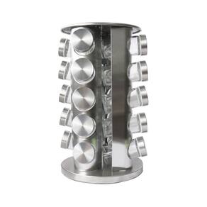 Porta tempero giratório com base redonda e com 20 potes de vidro para armazenamento de temperos e ervas.
