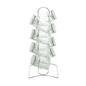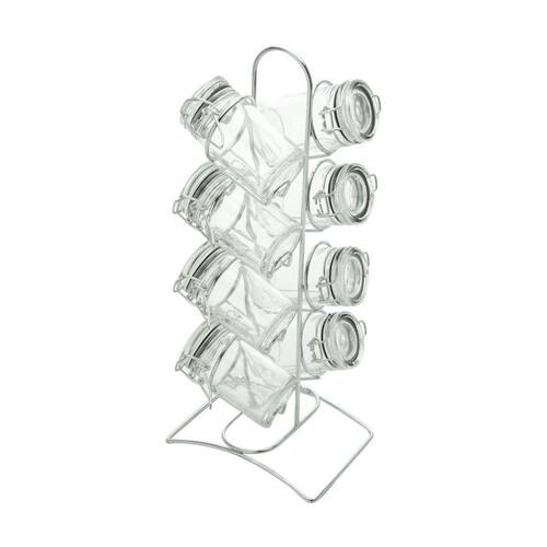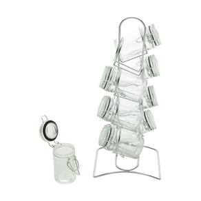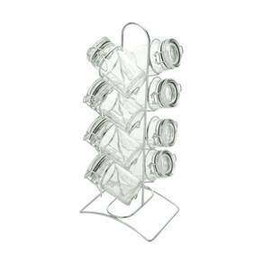 Descrição:Conjunto com 8 porta temperoPotes de vidro com tampa hermetica, capacidade para 65 ml.1 Suporte de metal cromado