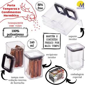 Mantenha seus temperos organizados com praticidade e um toque de elegância com este porta-condimentos com base suporte. O kit é composto por 2 potes com capacidade de 160ml cada, fabricados em poliestireno 100% transparente e livre de BPA, garantindo segurança no uso com alimentos e facilitando a visualização do conteúdo. As tampas herméticas ajudam a conservar melhor os aromas e sabores dos condimentos. A base inclinada proporciona um visual moderno e funcional, ideal para uso tanto no balcão quanto dentro da gaveta. Material: poliestireno Itens inclusos: - 2 porta condimentos com capacidade para 160ml. Comprimento: 5,9 cm / Largura: 5,9 cm / Altura: 8,3 cm - 1 suporte. Comprimento 13,1 cm / Largura: 13,6 cm / Altura: 7,4 cm