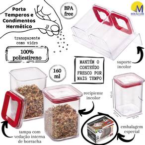 Mantenha seus temperos organizados com praticidade e um toque de elegância com este porta-condimentos com base suporte. O kit é composto por 2 potes com capacidade de 160ml cada, fabricados em poliestireno 100% transparente e livre de BPA, garantindo segurança no uso com alimentos e facilitando a visualização do conteúdo. As tampas herméticas ajudam a conservar melhor os aromas e sabores dos condimentos. A base inclinada proporciona um visual moderno e funcional, ideal para uso tanto no balcão quanto dentro da gaveta. Material: poliestireno Itens inclusos: - 2 porta condimentos com capacidade para 160ml. Comprimento: 5,9 cm / Largura: 5,9 cm / Altura: 8,3 cm - 1 suporte. Comprimento 13,1 cm / Largura: 13,6 cm / Altura: 7,4 cm