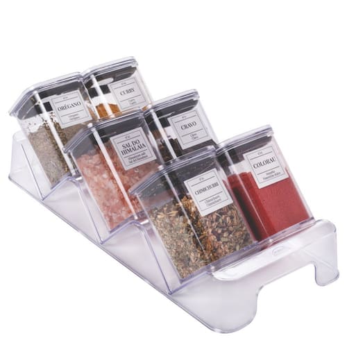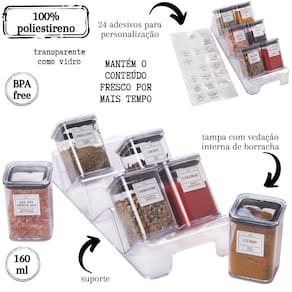 Mantenha seus temperos organizados com praticidade e um toque de elegância com este porta-condimentos com base suporte. O kit é composto por 6 potes com capacidade de 160ml cada, fabricados em poliestireno 100% transparente e livre de BPA, garantindo segurança no uso com alimentos e facilitando a visualização do conteúdo. As tampas herméticas ajudam a conservar melhor os aromas e sabores dos condimentos. A base inclinada proporciona um visual moderno e funcional, ideal para uso tanto no balcão quanto dentro da gaveta. Acompanha uma cartela com 24 adesivos diferentes para identificação dos temperos, permitindo que você personalize cada pote de acordo com suas preferências e mantenha tudo ainda mais prático no seu dia a dia. Material: poliestireno Itens inclusos: - 6 porta condimentos com capacidade para 160ml. Comprimento: 5,9 cm / Largura: 5,9 cm / Altura: 8,3 cm - 1 suporte. Comprimento 29,2 cm / Largura: 12,6 cm / Altura: 4,3 cm