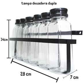 Porta temperos e condimentos 6 potes tampa dosadora dupla A cozinha ao passar do tempo vem sendo um dos lugares mais importantes da casa, Para deixar ela mais moderna, elegante e prática o porta tempero é a solução, além de Organizar todos os seus temperos e especiarias também os conservam deixando tudo mais Fácil e em sua disposição na hora de cozinhar e arrasar nas receitas Nosso porta tempero é extremamente especial, além de todos os beneficios também pode Acoplar até 3 porta temperos caso queria fazer um upgrade em sua cozinha e ter varios deles, pois É um porta tempero vertical, podendo ser fixado em azulejo, parede, etc. Comprando conosco você terá o melhor atendimento desde antes da compra e até o pós-compra, CONTEÚDO NA EMBALAGEM - 1 suporte de tempero de ferro na cor preta - 1 par de parafuso/bucha para fixação - 6 potes de tempero de plástico com tampa dosadora dupla giratória - 1 barra para fixação do suporte INFORMAÇÕES IMPORTANTES SUPORTE: é feito de ferro e pintado com tecnologia eletrostática, dando a ele Melhor acabamento. -28cm de comprimento, 14cm de altura e 7cm de largura POTES: são de plástico tipo PET, com parede grossa muito resistente. -13,5 cm de altura e 4,5 largura -220ml -posso utilizar ventosa para fixar o suporte R: você até consegue improvisar e usar ele com venstosas, porém vale ressaltar que não acompanha as ventosa E esse modelo de porta tempero foi feito para utilizar a barra fixa com parafuso e bucha. -qual o material do porta tempero R: É composto por um suporte de ferro com pintura eletrostática de altíssima qualidade e Os 6 potes de temperos são de plástico tipo PET com parede grossa, super-resistente -qual o Tempo para fazer o envio Marca: Armazém Do Brasil Ean: 7804076342124