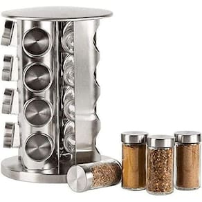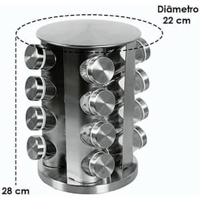 Porta Temperos Giratório Inox 16 Potes Ideal para você que procura uma maneira diferente, bonita e eficiente de organizar seus temperos, confeccionado em aço inox, o porta temperos também possui uma base giratoria 360, que facilita na hora de encontrar seus temperos. Ao total são 16 frascos de vidro que possuem tampa inox. - Medidas frasco: 4 x 9,5 x 4 CM largura x altura x profundidade - Medidas: 16 x 28 x 16 CM largura x altura x profundidade