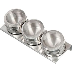 ESPECIFICAÇÕES: Material: Aço Inoxidável Comprimento da Base: 21cm Largura da Base: 7,5cm Diâmetro dos Frascos: 6,5cm Altura dos Frasco: 4,5cm Peso individual dos Frascos: 58g Peso da Base: 96g Peso Total: 274g Cor: Cinza Metálico