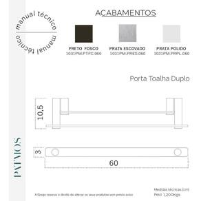 - linha: patmos - modelo: porta toalha duplo barra - cor e acabamento: prata alto brilho - tecnologia: parafusos com dupla fixação - dimensões: vide imagem - itens enviados: 1 porta toalha duplo barra 60cm e kit de acessórios para instalação. enviamos manual de instalação