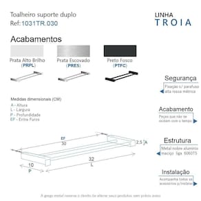 ITENS ENVIADOS: 1 toalheiro duplo 30cm, kit de parafusos e manual instrução instalação.