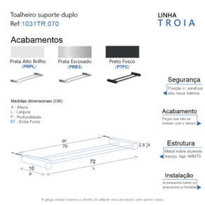 Além de decorar, organiza com funcionalidade o banheiro. Criado em metal nobre com uma qualidade que abrange áreas litorâneas e possui a garantia de um acabamento muito resistente.