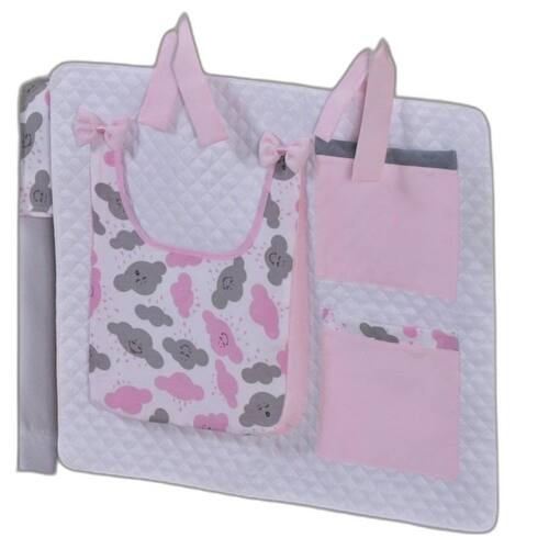 Porta Treco e Fralda Organizador Quarto de Bebê Menino Menina 1 Peça Com Laço Cor: Nuvem rosa O porta fraldas é ideal pra ter sempre a mão os produtos mais no dia a dia com seu bebê. Nosso porta fralda/treco tem 2 bolsos menores, onde podem ser colocados produtos pequenos, e 1 bolso maior pra colocar as fraldas, roupas, toalhas ou itens maiores. Praticidade e decoração em um só produto. Sugestão de uso: Pendurado em varão ou no berço Contém na embalagem: 1 porta fraldas Medidas: 64cm larg x 54cm alt - 1 bolso 37cm alt x 27cm larg x 5cm prof - 2 bolsos 21cm alt x 18cm larg Composição: Matelado de microfibra 100% poliéster Tecido estampado e liso percal 180 fios 100% algodão - Foto ilustrativa, tonalidade da cor pode variar um pouco no produto real Produtos fabricados em Ibitinga-SP, a Capital Nacional do Bordado e do Enxoval. Marca: Não Informado