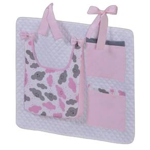 Porta Treco e Fralda Organizador Quarto de Bebê Menino Menina 1 Peça Com Laço Cor: Nuvem rosa O porta fraldas é ideal pra ter sempre a mão os produtos mais no dia a dia com seu bebê. Nosso porta fralda/treco tem 2 bolsos menores, onde podem ser colocados produtos pequenos, e 1 bolso maior pra colocar as fraldas, roupas, toalhas ou itens maiores. Praticidade e decoração em um só produto. Sugestão de uso: Pendurado em varão ou no berço Contém na embalagem: 1 porta fraldas Medidas: 64cm larg x 54cm alt - 1 bolso 37cm alt x 27cm larg x 5cm prof - 2 bolsos 21cm alt x 18cm larg Composição: Matelado de microfibra 100% poliéster Tecido estampado e liso percal 180 fios 100% algodão - Foto ilustrativa, tonalidade da cor pode variar um pouco no produto real Produtos fabricados em Ibitinga-SP, a Capital Nacional do Bordado e do Enxoval.