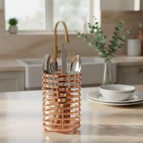 O Porta Utensílios em Metal Cobre Rose Gold é a combinação perfeita entre praticidade e elegância. Seu design moderno com estrutura geométrica traz um toque sofisticado para a bancada da cozinha, deixando os utensílios sempre organizados e ao alcance das mãos.