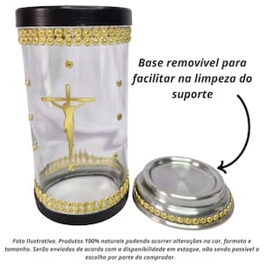 O Suporte de Vela Jesus Cristo Cruz da Bialluz é feito de alumínio e vidro, sendo ideal para uma vela de 7 dias. Por ser um castiçal com material antichamas, você tem maior segurança ao acender suas velas. Esse lindo presente é delicadamente decorado de forma artesanal para garantir a elegância e qualidade de cada peça. Com detalhes luxuosos que brilham e cores vivas que deixam o vaso ainda mais maravilhoso. É um excelente presente para valorizar a decoração do seu ambiente. Seus guardiões e guardiãs agradecerão tanto carinho, cuidado e beleza desse presente. A Bialluz é uma empresa idônea e especializada em pedras semipreciosas e produtos artesanais de decoração.Nossos produtos são selecionados ou produzidos com muito carinho e embalados com o máximo cuidado possível para que a sua experiência seja inesquecível.