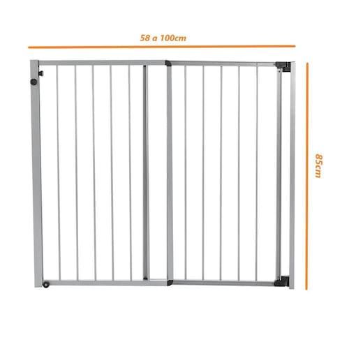 Possui 85 cm de altura e largura regulável, variando de 58 cm até 100 cm sem precisar de extensor além disso, o portão de correr reall articula 180º, ou seja, abre tanto para dentro como para fora. E o melhor: o vão é livre diferente de outros produtos no mercado, que possuem uma barra na parte inferior, o portão de correr reall tem um design exclusivo, garantindo maior segurança para sua família pois não há risco de tropeçar.
