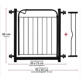 Observações Iniciais: Você pode utilizar o portão em duas opções de vãos: - Portão sem extensor: 69 cm à 73 cm - Portão com o extensor de 10 cm: 79 cm à 83 cm Indicado para: cães de pequeno, médio porte, e também para crianças. Não possui cantos vivos na estrutura o que promove mais segurança a seu bebe. Características Gerais: - Estrutura tubular reforçada; - Pintura com tinta epóxi a pó; - Instalação rápida e MUITO FÁCIL sem danos às paredes e sem furos; - Trava se segurança (evita que seu bebê ou cão abra com facilidade); - Abre para Ambos os Lados. Dimensões do Produto: - Altura 69 cm; - Largura:84 cm Sem Extensor (69 a 73cm) Com Extensor (79 a 83cm) - Distância entre as grades: 5 cm. Marca: Não Informado