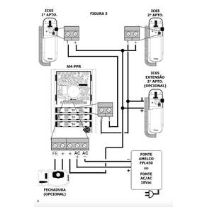 Porteiro eletronico coletivo 12 pontos amelco am-ppr12 Porteiro eletrônico coletivo amelco 12 pontos unidade externa am-ppr12 A amelco, buscando oferecer cada vez mais soluções em segurança eletrônica para seus clientes, apresenta o porteiro predial am-ppr. O design moderno, acionamento universal de fechadura 12 vdc, funcionamento mesmo com um ou mais interfones fora do gancho, Sistema de identificação de interfones fora do gancho, além da possibilidade de integração com centrais de portaria amelco, modelos amccd10, am-c100 e cpc4b, torna este produto o mais completo e eficiente do mercado. Composição do sistema O sistema é composto de um porteiro predial am-ppr, uma fonte de alimentação fpl-450 ou fonte ac/ac 18 vca itens não inclusos E interfones ic65, ic55 ou ic45 itens não inclusos . Aplicação Comunicação entre o interior e o exterior de prédios, condomínios etc. Este sistema evita que você ou alguém de sua família se Exponha indo até o portão para atender um visitante desconhecido, oferecendo maior segurança e conforto. Aplicação quando há 2 entradas ou entrada principal e divisão em blocos Esta integração utiliza interfones ic65i ou ic55i. O interfone ic65i possui 4 terminais para ligação dos fios. A chamada dos porteiros São diferenciadas para identificação da origem da chamada, após a identificação da chamada o interfone possui uma chave para Selecionar o atendimento do porteiro a entrada principal ou porteiro b entrada do bloco . O acionamento da fechadura é realizado no Porteiro que está selecionado. Características gerais - porteiro com design moderno, fabricado em plástico abs de alto impacto e alumínio brilhante - o sistema continua funcionado mesmo com um interfone ou mais fora do gancho o toque é re-habilitado após, aproximadamente, 2 minutos de comunicação - possui mecanismo para identificação de interfones fora do gancho - permite integração com centrais de portaria amelco modelos am-ccd10, am-c100 e cpc4b - ajuste do volume de áudio de transmissão e recepção - indicador de interfone fora do gancho através de led - possibilita instalação de botão adicional, para acionamento do fecho ou fechadura eletromagnética - fonte ac/ac 18vca amelco ou fonte dc fpl450 amelco. Instalação A melhor maneira de se obter uma instalação perfeita e garantida é contratar um posto de serviço autorizado da amelco. No caso de Ainda não tê-lo em sua cidade, contrate os serviços de um profissional com comprovada experiência em instalações de sistemas De comunicação. Atenção: danos causados por erros de instalação ou uso inadequado não são cobertos pela garantia, vide certificado de garantia do produto.