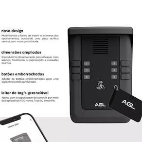 Gestão de tags e configurações simples através do aplicativo agl home; Saída 'ff' pulsante para abertura de fechaduras elétricas de 12v1a;