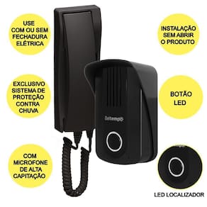 - Não entra água, pode ser instalado com ou sem capa de chuva, não ESTRAGA com o SOL, feito em ABS super RESISTENTE. - Botão para acionamento de fechadura, pode ser usado com ou sem fechadura elétrica - Aceita até mais 2 extensões, você pode ter 3 pontos de atendimento dentro da sua casa ou empresa, muito mais comodidade, muito útil para pessoas que tem 2 casas no mesmo terreno.