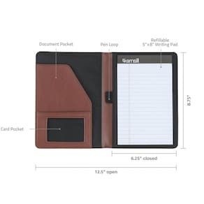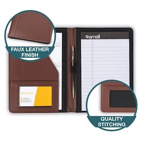 Samsill Portfólio de couro sintético de costura contrastante, padfólio profissional de entrevista de negócios tamanho mini, inclui bloco de escrita de 12 x 20 cm, marrom - Portfólio profissional: este organizador de portfólio é projetado e fabricado para homens e mulheres profissionais. Sua capa de couro sintético colada tem a aparência e a sensação de couro marrom genuíno. Uma pasta essencial para todos os profissionais que trabalham - Função encontra o design: o design minimalista cria um portfólio de negócios funcional e sem bagunça. Inclui um bloco de notas e apresenta um esquema de cores contrastantes do exterior marrom e costura creme - Tamanho compacto: o organizador de portfólio de tamanho mini menor é fino e elegante. Feito para caber facilmente na maioria das bolsas, bolsas ou pastas quando você estiver em movimento. Ótima pasta de entrevista para guardar documentos em papel ou cartões de visita - Fácil organização do papel: organize cartas, páginas soltas, identidades, envelopes, papéis, documentos e cartões de visita com facilidade usando bolsos internos e compartimentos nesta mini pasta - Armazenamento conveniente: este portfólio tem um bolso interno que pode ser utilizado para armazenar um mini caderno e documentos de 12,7 x 20,3 cm. Também pode ser utilizado como um bolso para tablet para a maioria dos tablets de até 7,9 polegadas de tamanho