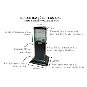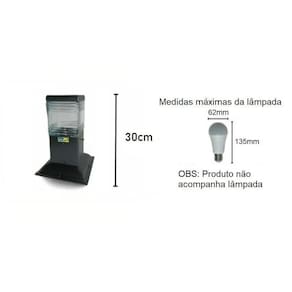 Especificações Técnicas: Altura: 30cm; Dimensões da base: 15,8cm x 15,8cm; Dimensões do corpo: 9cm x 9cm Base e chapéu injetado em material termoplástico de alta resistência; Lente em vidro; Soquete em porcelana para 01 lampada - bocal E-27; Bocal E27; Comporta lampada de até 62mm de largura e 135mm de altura; Corpo em PVC tratado; Cor: Preto; Peso: 0,940kg Potência máxima 60W; Tensão máxima 220V; Fixação: 04 furações para fixação da base no solo; Somente para lâmpadas eletrônicas ou led. Marca: NYLUX
