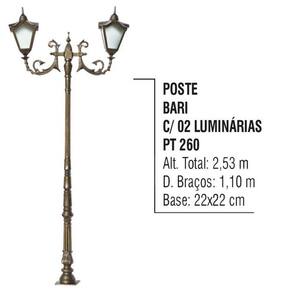 Poste Colonial Bari Para Jardim Alumínio 02 Luminária 2,53m Poste para jardim, ideal para condomínios, jardins, praças, parques, estacionamentos, vias urbanas e áreas externas em geral. Pode ser utilizada em regiões de praianas, pois não sofre ação da maresia. Ótimo custo benefício. Possui Alongamento para reator. Características: Material Alumínio Fundido e Vidro. Cores disponíveis: Preto Brilhante, Branco, Dourado Craqueado, Dourado Pátina, Ouro Velho, Preto Fosco, Amarelo, Vermelho, Azul, Marrom, Prata Craqueado, Grafite e Verde Musgo Texturizado. Favor informar no campo de mensagem a cor desejada. Todas as cores citadas estão à mostra como imagem terciária do anúncio. Se o comprador não se pronunciar quanto a cor, será enviada a cor padrão Dourado Craqueado. Medidas: Altura total: 2,53m. Diâmetro dos Braços: 1,10cm. Base: 22x22cm. Poste sem lâmpadas. Lâmpada Compatível: E-27. (NÃO INCLUSA). Itens Inclusos: 01 Poste Colonial Bari Para Jardim Alumínio 02 Luminária 2,53m Código: PT260. ATENÇÃO - A instalação é de inteira responsabilidade do comprador.