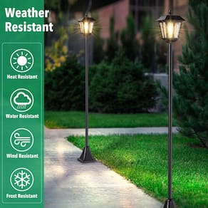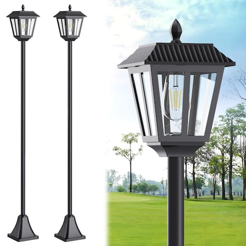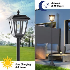 luzes de poste solares - Luz de poste de lâmpada solar: o poste de luz solar externo está equipado com quatro painéis solares de alta eficiência, melhorando significativamente a eficiência de carregamento. O tempo de carregamento é de apenas 4 a 6 horas e o tempo de iluminação contínua é de 8 a 12 horas (o tempo de iluminação será reduzido em tempo chuvoso). A luz solar liga automaticamente ao anoitecer quando o interruptor é ligado e desliga automaticamente ao amanhecer - Durável e confiável: o poste de luz solar de jardim é feito de aço inoxidável com um revestimento preto resistente à ferrugem para suportar altas temperaturas e corrosão. Seu design IP45 à prova d'água torna a luz solar externa mais capaz de lidar com várias condições climáticas. A cabeça de poste de luz solar externa usa material acrílico de alto peso molecular, que tem excelente transmissão de luz, é mais durável e não desbota facilmente. A lâmpada tipo E26 estende a vida útil do equipamento e usa quatro filamentos de tungstênio para alcançar uma emissão de luz uniforme de 360°, proporcionando uma faixa de iluminação mais ampla - Amplamente utilizado e decoração: A luz branca quente das luzes solares externas cria uma atmosfera aconchegante para o seu jardim, e também pode servir como um belo guia no final do pátio. Estes postes de luz solar para exterior são adequados para colocação em pátios, portas dianteiras/traseiras, quintais, calçadas e corredores - Alimentado por energia solar/instalação conveniente: as luzes solares de pátio são alimentadas por energia solar, sem a necessidade de fiação ou fontes de alimentação adicionais; dois métodos de instalação são fornecidos: (1) use os parafusos incluídos para fixar a base a uma superfície sólida; (2) use a haste de metal em forma de U incluída para instalação do gramado. Além disso, as luzes solares do caminho podem ser ajustadas em altura removendo a biela - Lembrete: Se você encontrar algum problema durante o uso, com nosso atendimento ao cliente a tempo e forneceremos um excelente serviço pós-venda. Antes de usá-lo pela primeira vez, certifique-se de ligar o interruptor e carregá-lo sob luz solar direta por 8 horas para obter o melhor efeito